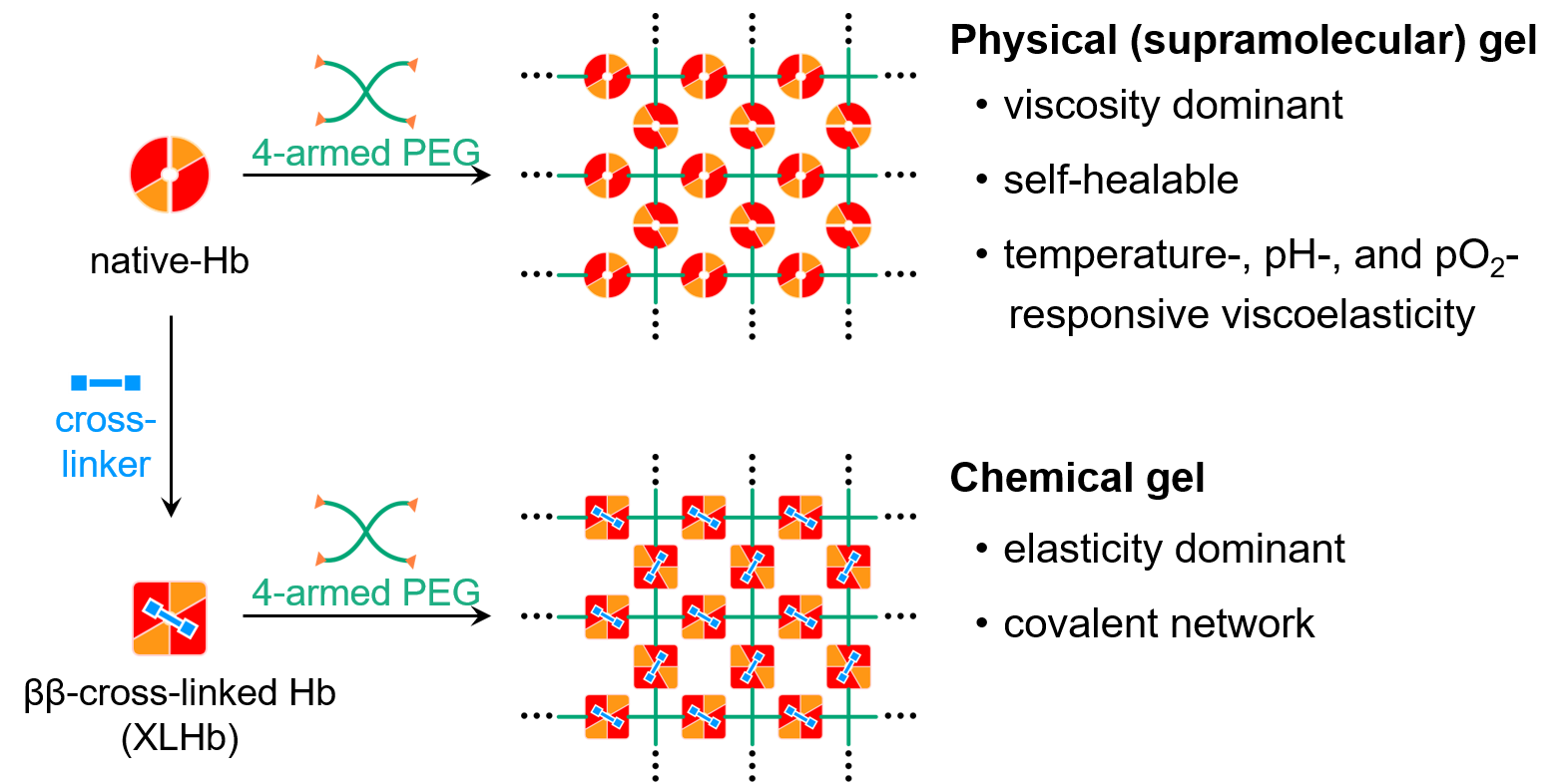四分岐PEGの末端をHbのβ鎖と反応させたところ、柔らかなハイドロゲルが形成されました。このゲルは、サブユニット間の非共有結合性相互作用によってネットワーク構造が維持される「超分子ゲル(物理ゲル)」に分類されます。得られたゲルは自己修復作用を示すだけでなく、温度、pH、酸素分圧(pO2)といった外部刺激に応答して粘弾性が可逆的に変化することが明らかとなりました。特に、酸素濃度に対する応答は、Hbの性質を反映した特異的な挙動と言えます。また、原料Hbをあらかじめ架橋して解離平衡を抑制した場合、形成されるゲルは共有結合のネットワーク構造を持つ「化学ゲル」となり、弾性支配的な挙動を示すことも分かりました。
